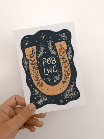 A lovely illustrated Welsh language good luck card with a folky horseshoe design.