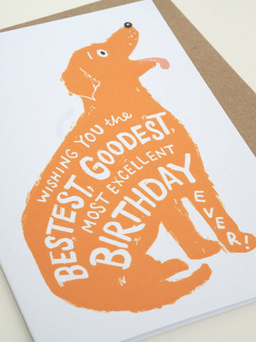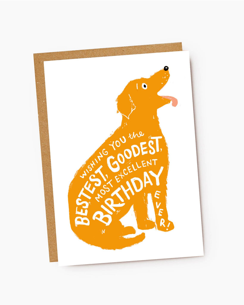 A fun birthday card for dog lovers, featuring a happy yellow Labrador with playful hand lettering fitting into the dog's shape, reading 'Wishing You The Bestest, Goodest, Most Excellent Birthday Ever!'
