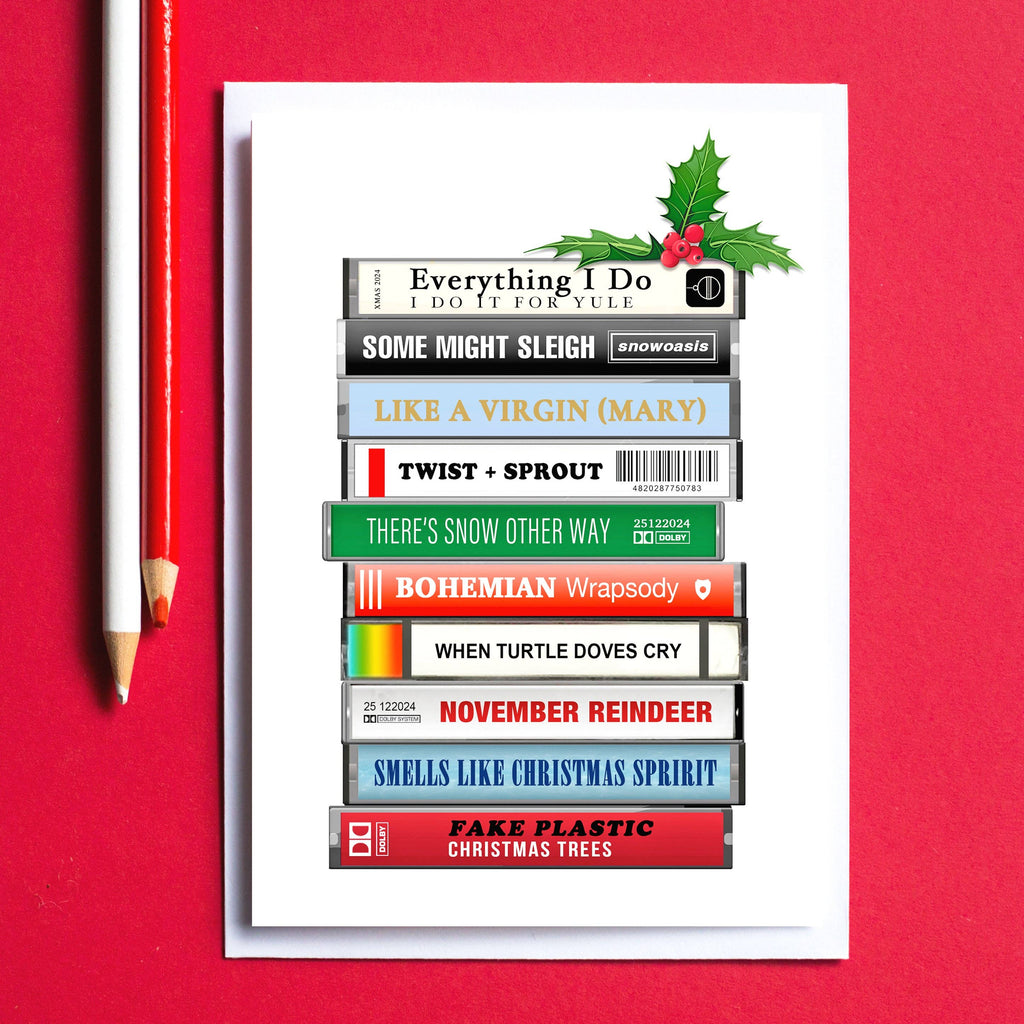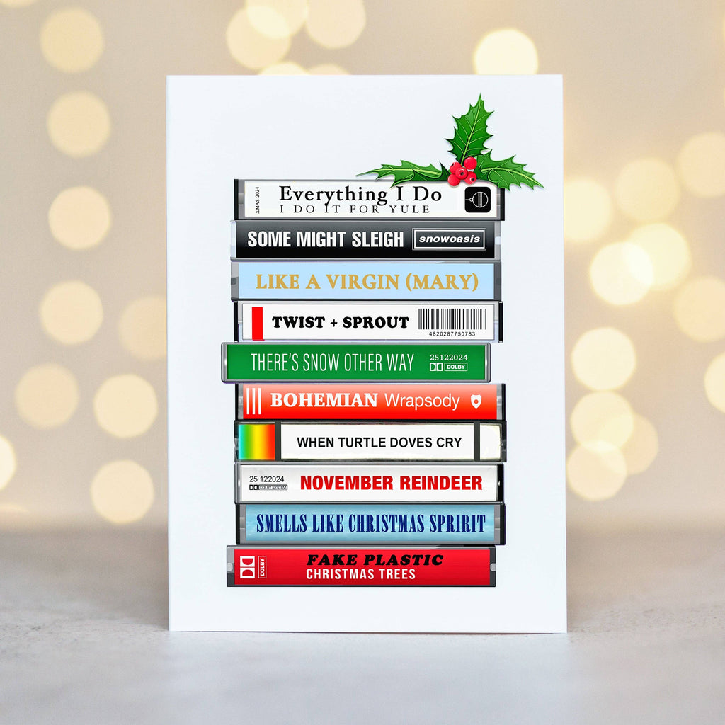 This funny Christmas card hits all the right notes with its clever mix of festive song puns and retro cassette design. Ideal for music lovers and anyone with a great sense of humour, it features a stack of old-school tapes, each labelled with hilarious holiday twists on famous song titles like 'Twist & Sprout' and 'November Reindeer.' Guaranteed to be a hit with anyone who loves a good laugh or enjoys a bit of festive nostalgia. The funny music pun Christmas cards are printed on eco friendly, recycled board and they are blank inside for you to put your own festive message with a white envelope.